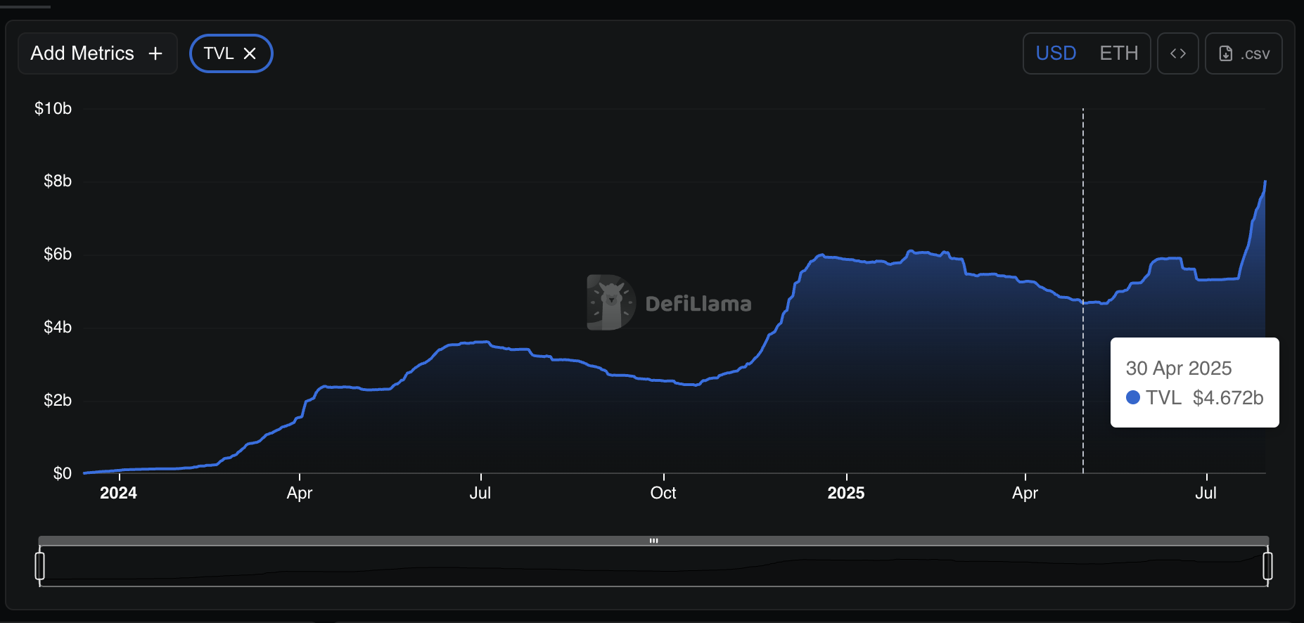 The total supply of USDe has grown nearly 80% since April 30, jumping from around 4.66 billion to over 8.03 billion. Alongside that, the percentage of USDe staked has climbed from about 45% to 56.3%, showing rising confidence in earning additional returns from these stable derivatives. Ethena’s own TVL (Total Value Locked) has risen to $8.1 billion, reflecting strong capital inflows.
