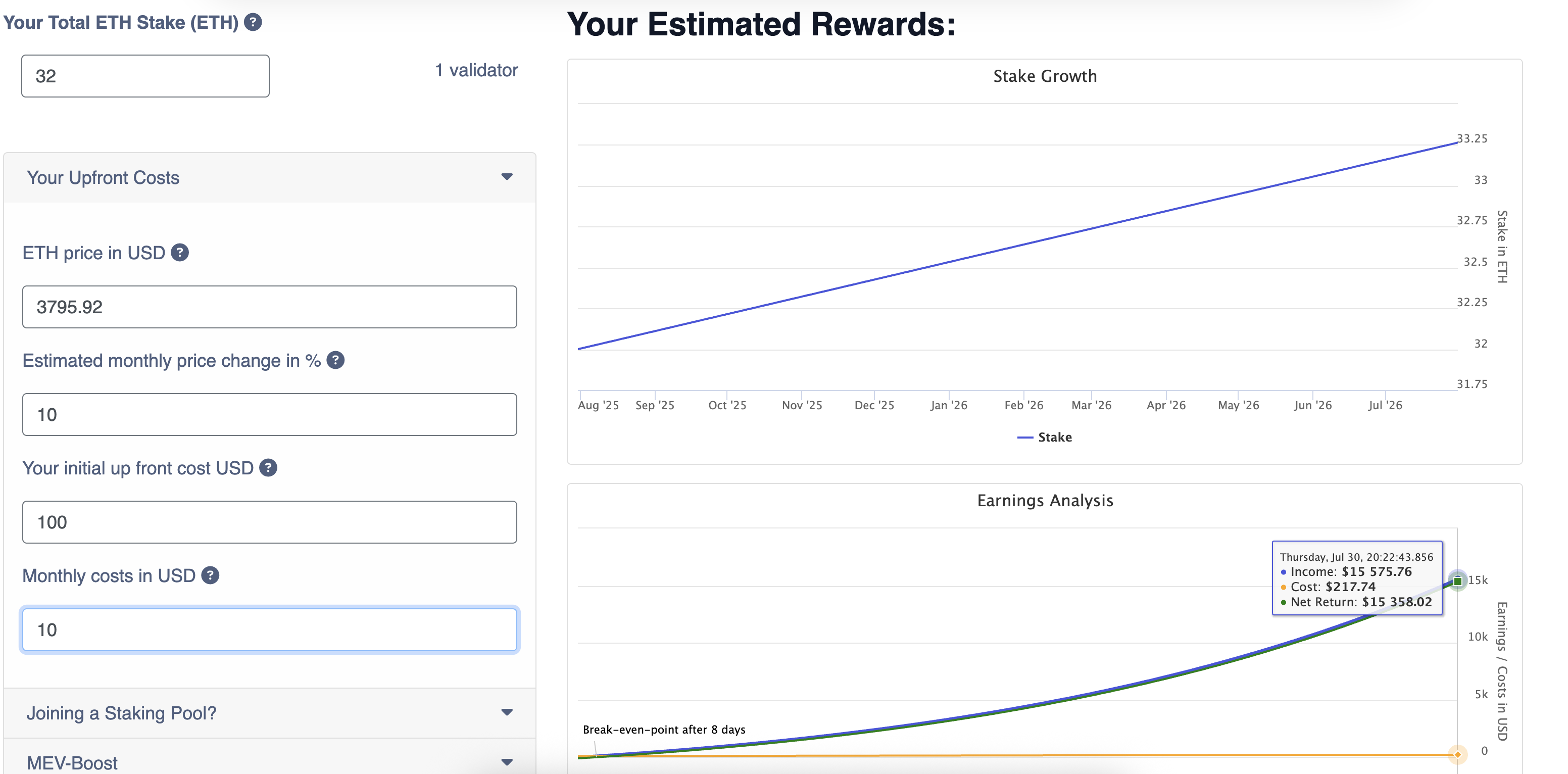 Despite the network requiring 32 ETH to run a solo validator, which keeps this route limited to large holders, the rewards remain compelling. A standard validator could earn a net return of around $15,358 in one year, assuming the current ETH price of $3,795 and average growth rates.
