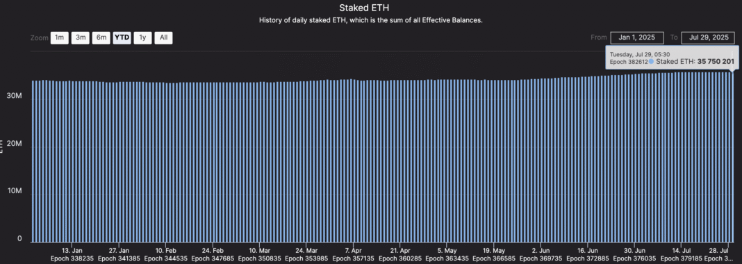Ethereum’s recent rally is pulling more coins into staking contracts as investors chase additional returns beyond price gains. Beacon Chain data shows 35,750,201 Ethereum (ETH) staked as of July 29, steadily growing since the start of the year.