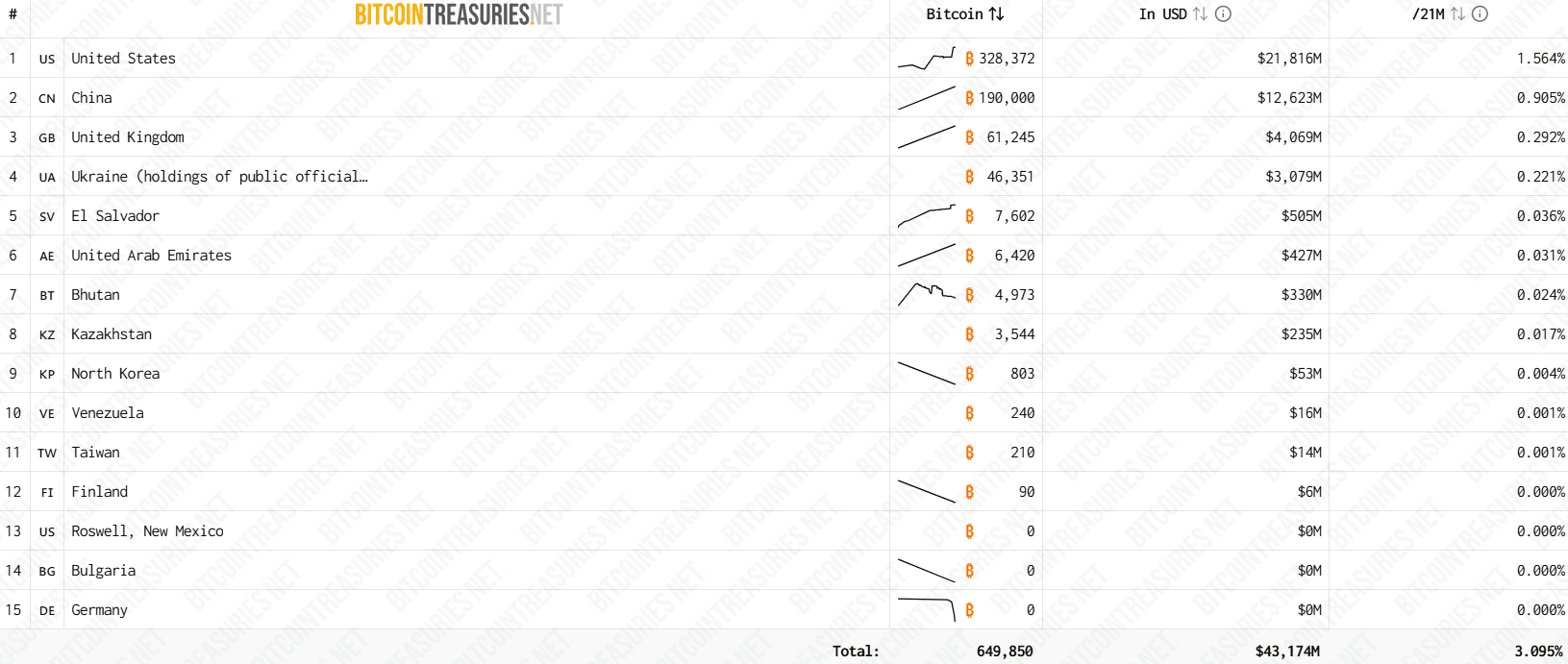 The US continues to dominate global government Bitcoin holdings, controlling over 328,000 BTC valued at $22 billion, a growth fueled by last October’s landmark seizure of 127,271 BTC.