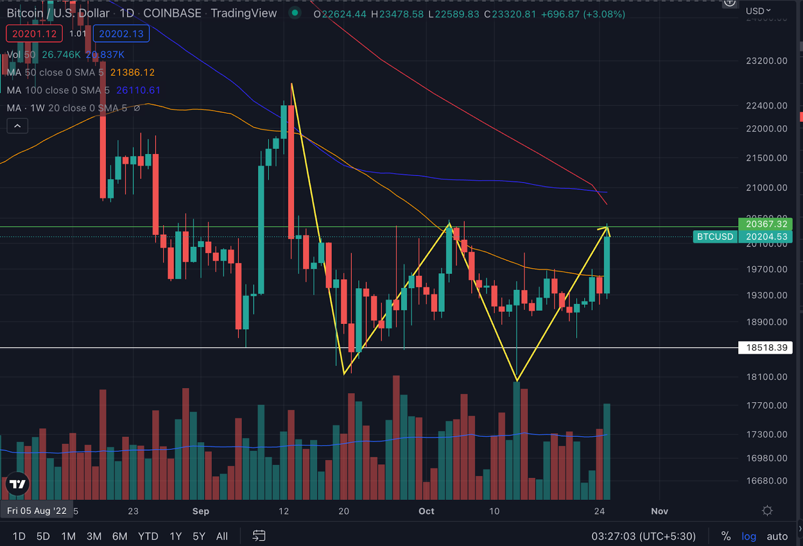 A daily close above $21,000 is needed to sustain the pump because this is the area of solid resistance. The price rally may slow with the resistance from 100-day SMA and 20-week SMA that falls in the area. A daily candle closes above these SMAs may send the price pumping to the 23,000+ area.