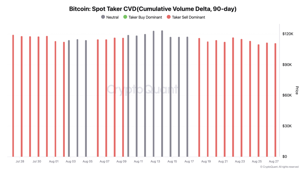 It reflects a cooling of aggressive buying interest and a growing willingness among BTC spot traders to offload positions, signaling exhaustion in the market.