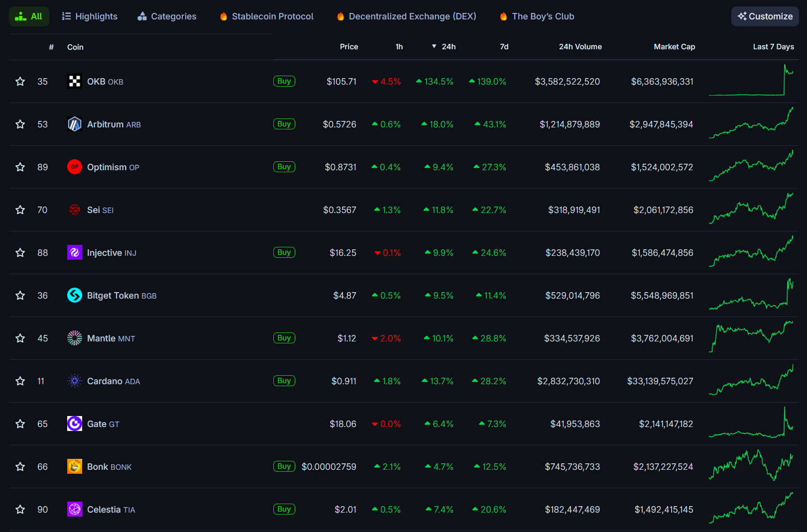 In daily returns, OKX’s OKB token led with a 134% surge. Other exchange tokens, including Bitget’s BGB, Gate’s GT, and KuCoin’s KCS, as well as Ethereum layer 2 tokens like Optimism’s OP and Arbitrum’s ARB, also posted strong gains.