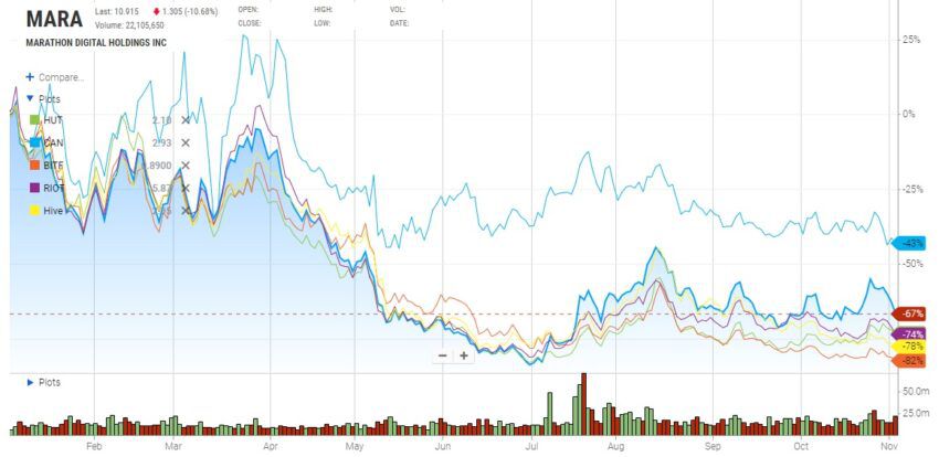 Plummeting stock prices across the sector clearly show how the bear market is impacting big Bitcoin miners.