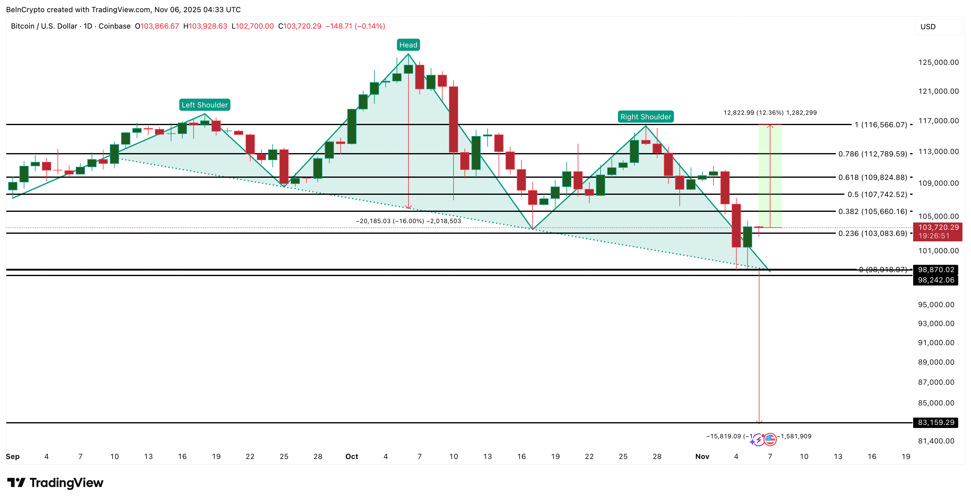 For the Bitcoin price to shift bullish again, it must hold above $103,000 and reclaim $105,600 in the short term. The key confirmation level lies at $116,500, roughly 12% above current prices. A break above it would invalidate the head and shoulders pattern and confirm a stronger recovery phase.