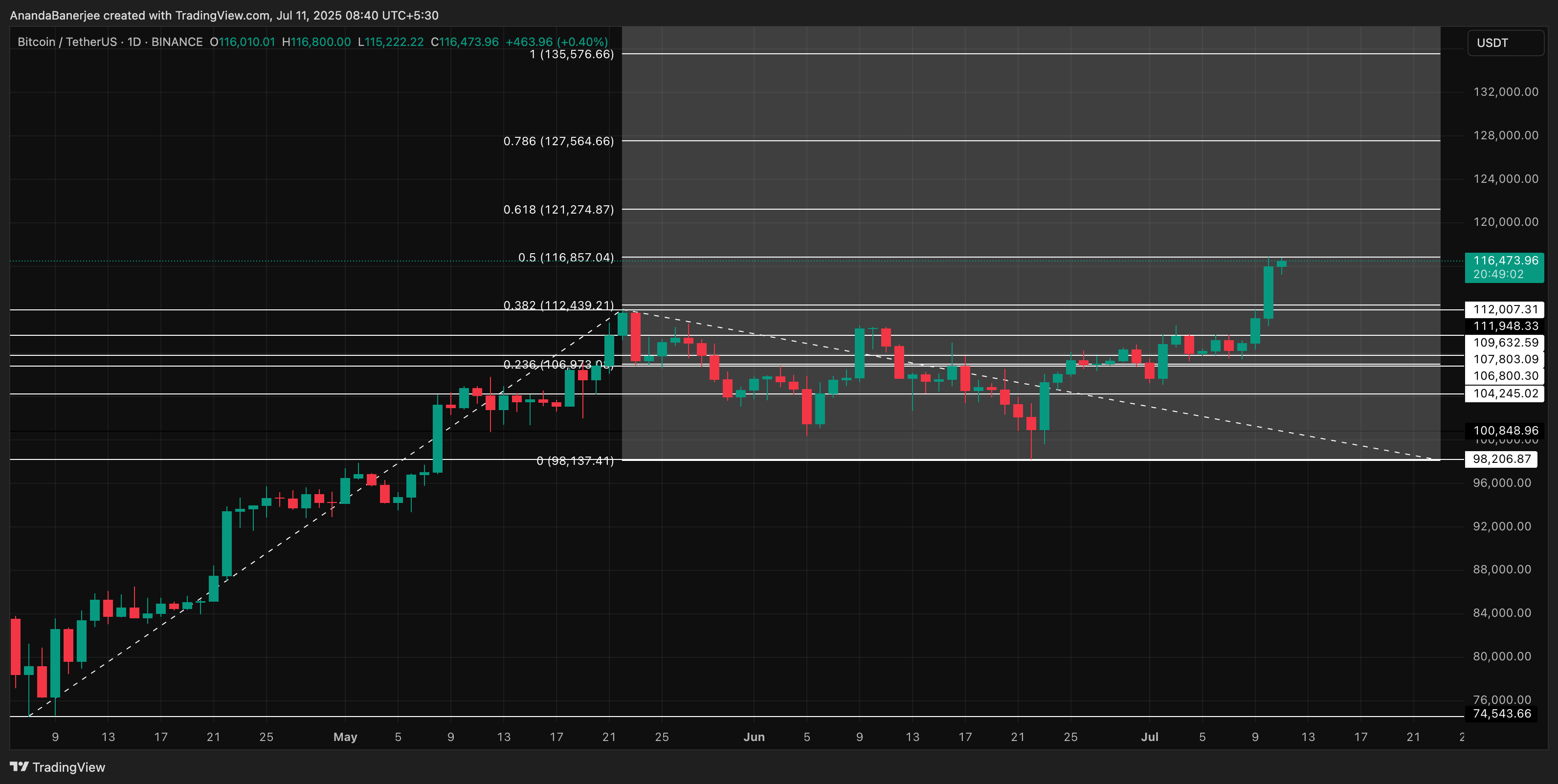 From the swing low of $74,543 to the May high of $111,980, and considering the retracement to $98,000, we get the following resistance levels: