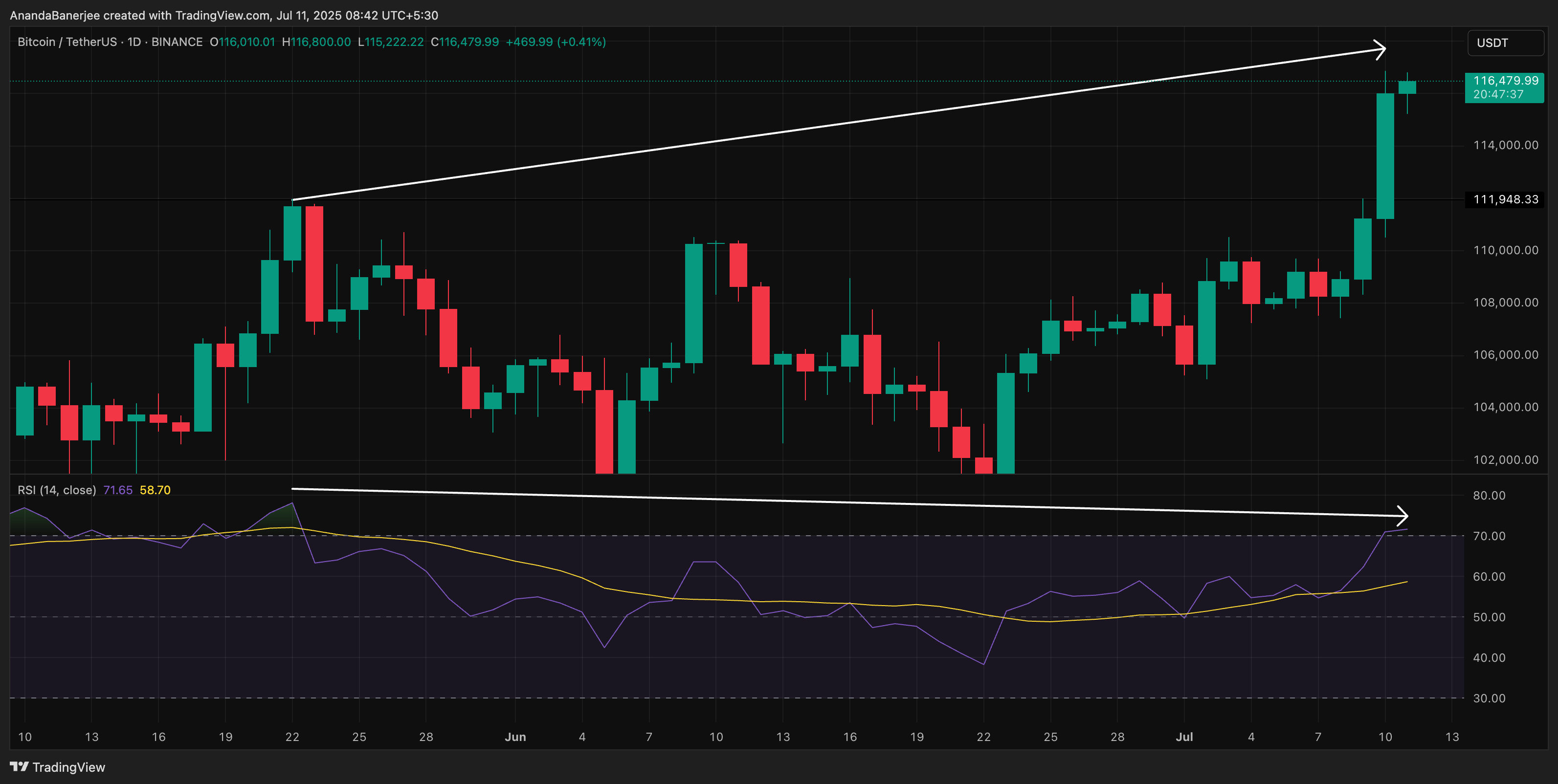 Here’s the risk. While the BTC price has continued to make higher highs, the Relative Strength Index (RSI) has made lower highs — a textbook bearish divergence. This can often precede a correction.