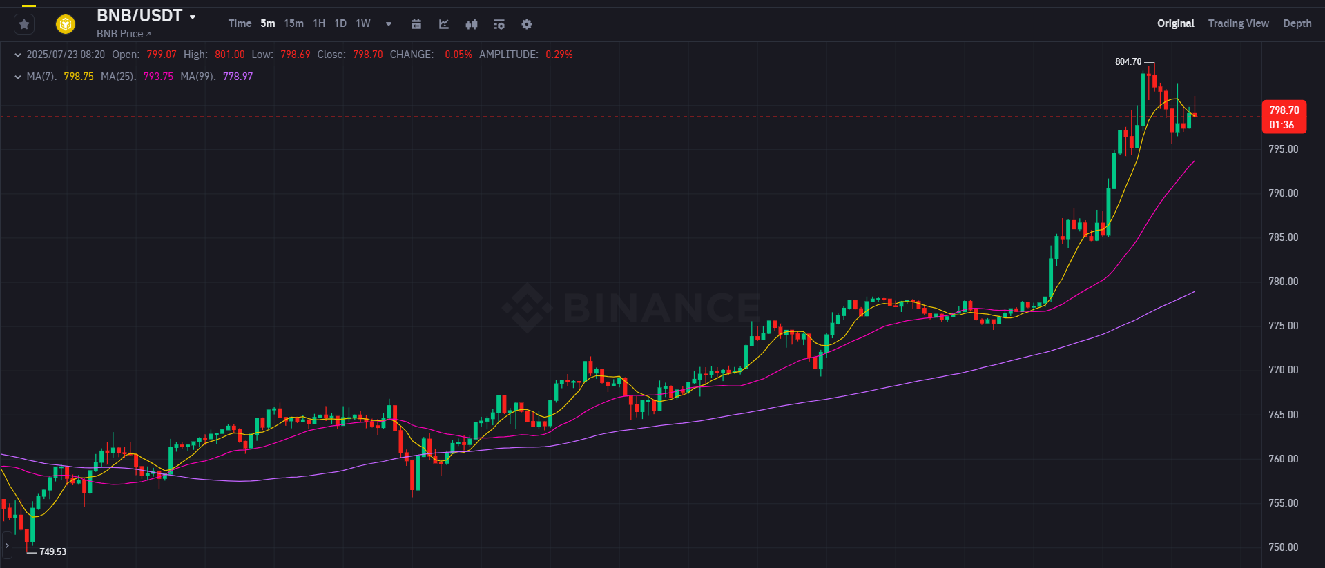 - BNB hit a new all-time high above $800, outperforming Bitcoin and reclaiming the fifth spot in market capitalization.