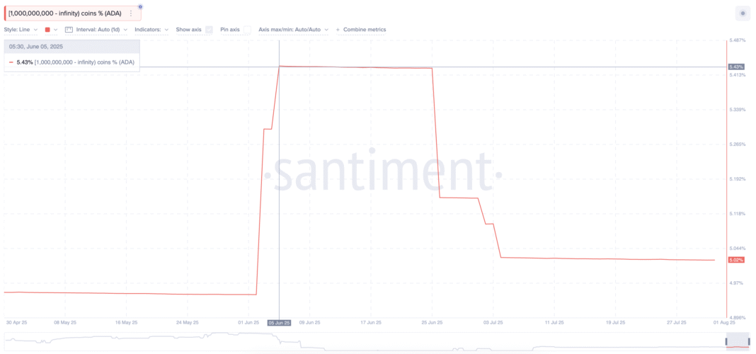 On-chain data shows Cardano’s biggest wallets, holding from 1 billion ADA up to infinity, have cut their holdings from 5.43% in late June to 5.02% now, signaling a clear bearish tilt from major players. Even though the percentage dip doesn’t read much, even a half-a-percent drop is massive when it comes to whale holdings.