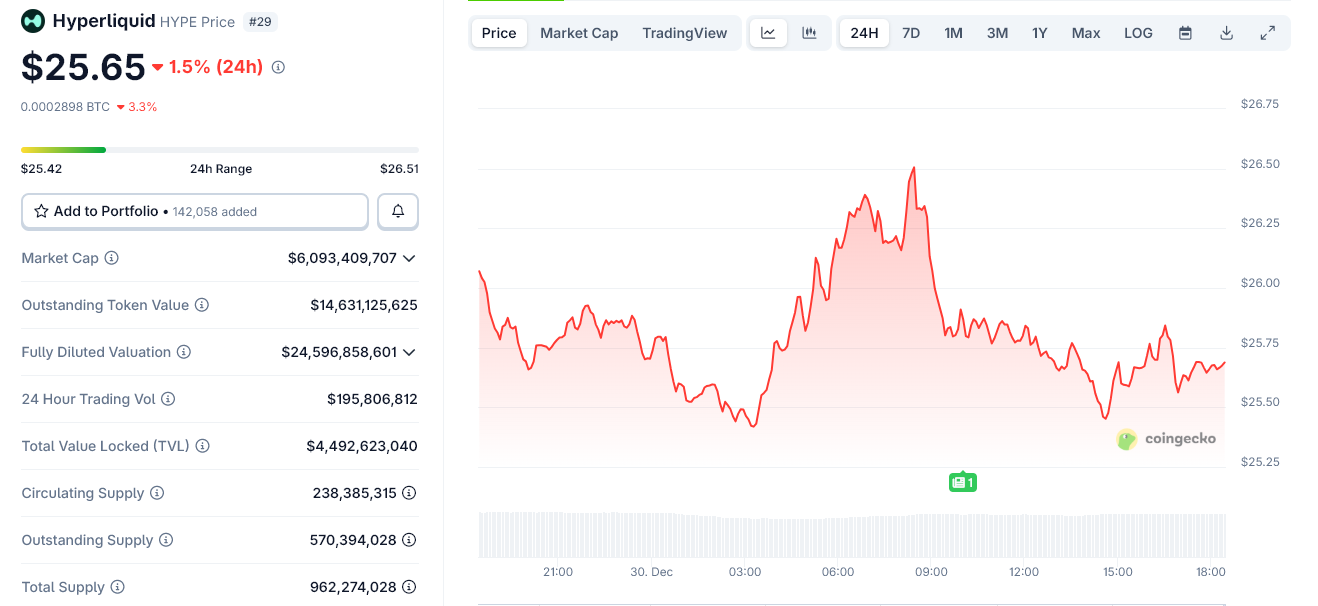 Meanwhile, broader perp DEX tokens moved lower following LIT’s debut. Hyperliquid’s HYPE token slipped around 1.5% on the day, while Aster’s ASTER token also trended down, despite no protocol-specific announcements.