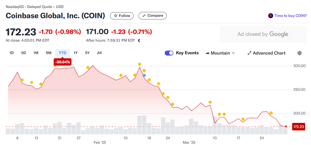 - Coinbase shares fell 31%, marking their steepest drop since the FTX collapse in late 2022.