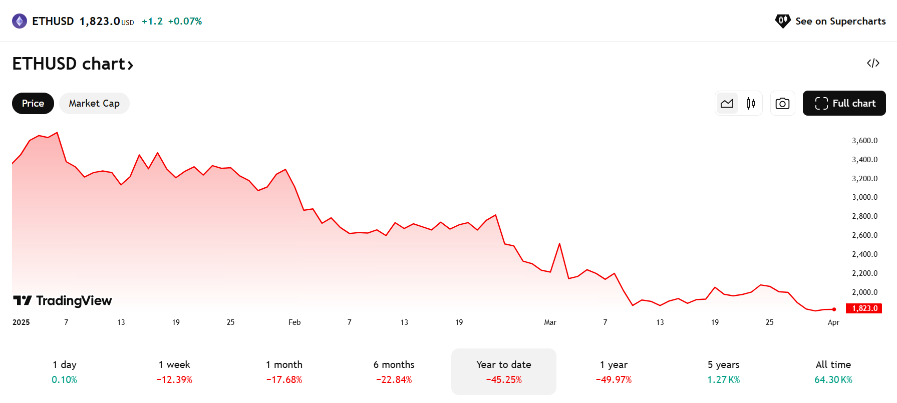 Ether has crashed 45% so far this year, now hovering around $1,800.