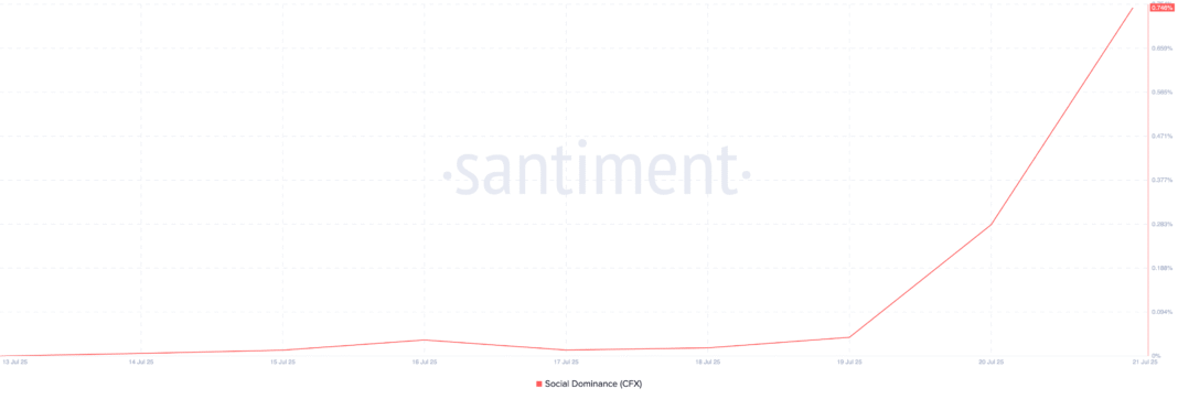 According to Santiment, CFX’s social dominance—a metric that tracks the percentage of crypto-related discussions focused on the asset—has soared to an all-time high. Per the on-chain data provider, this stood at 0.74% at press time, confirming the notable surge in online chatter about CFX.