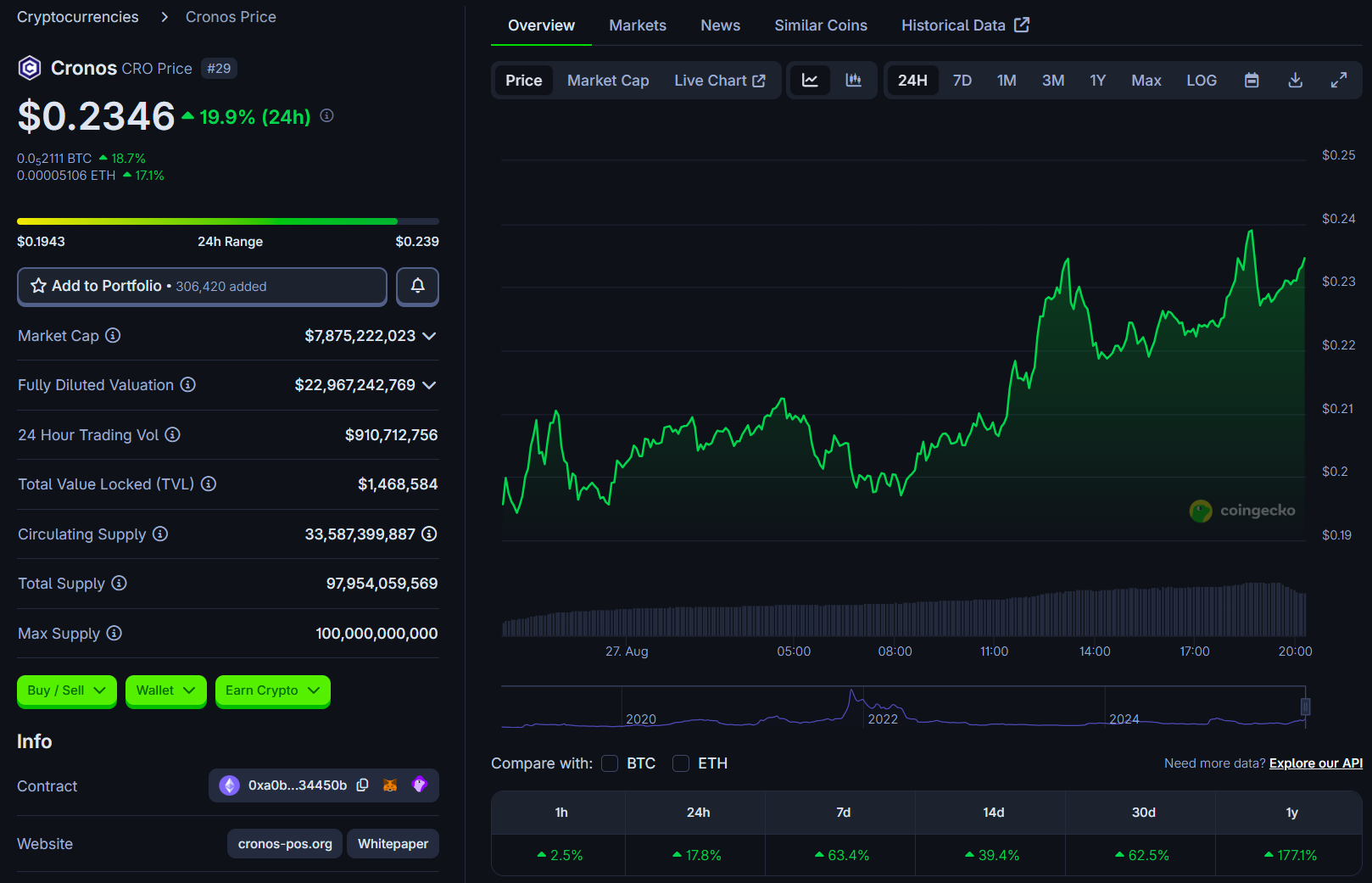 According to CoinGecko data, CRO advanced from around $0.16 to approximately $0.24 following the latest developments, with 24-hour trading volume surpassing $900 million.