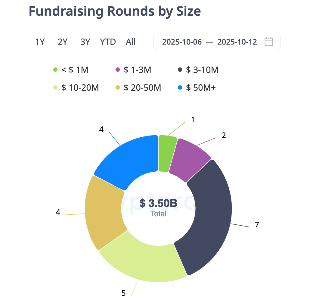 The most common funding bracket during the week was the $3–10 million range, which accounted for 7 rounds. Another 5 rounds fell within the $10–20 million range. Larger rounds also played a significant role.