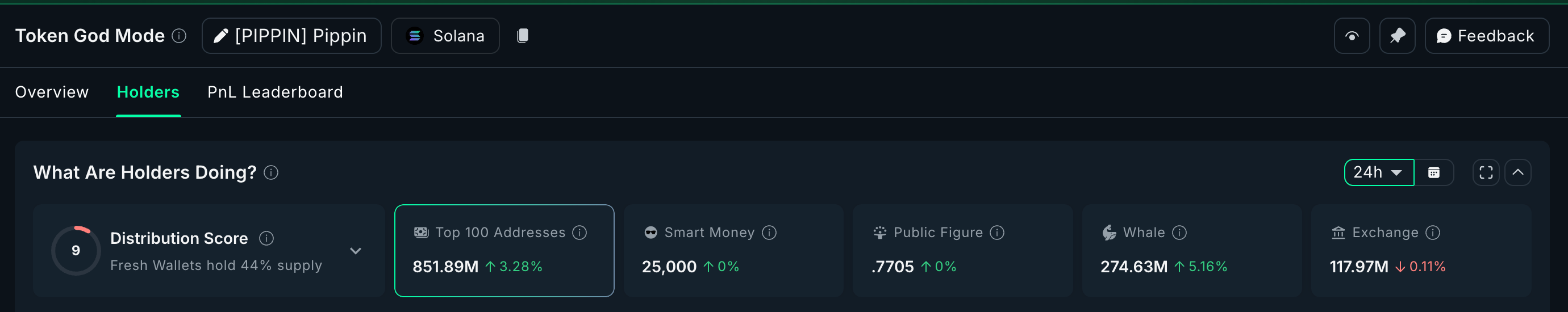 Over the last 24 hours, standard whales increased their holdings by 5.16%. After this change, they now hold 274.63 million Pippin tokens, which means they added about 13.45 million tokens. Top 100 addresses added 3.28% and now hold 851.89 million, which means an additional 27 million tokens. Together, whales added almost 40.45 million Pippin tokens, worth about $7.28 million. This is one of the strongest whale accumulation clusters seen in this meme-coin group this month.