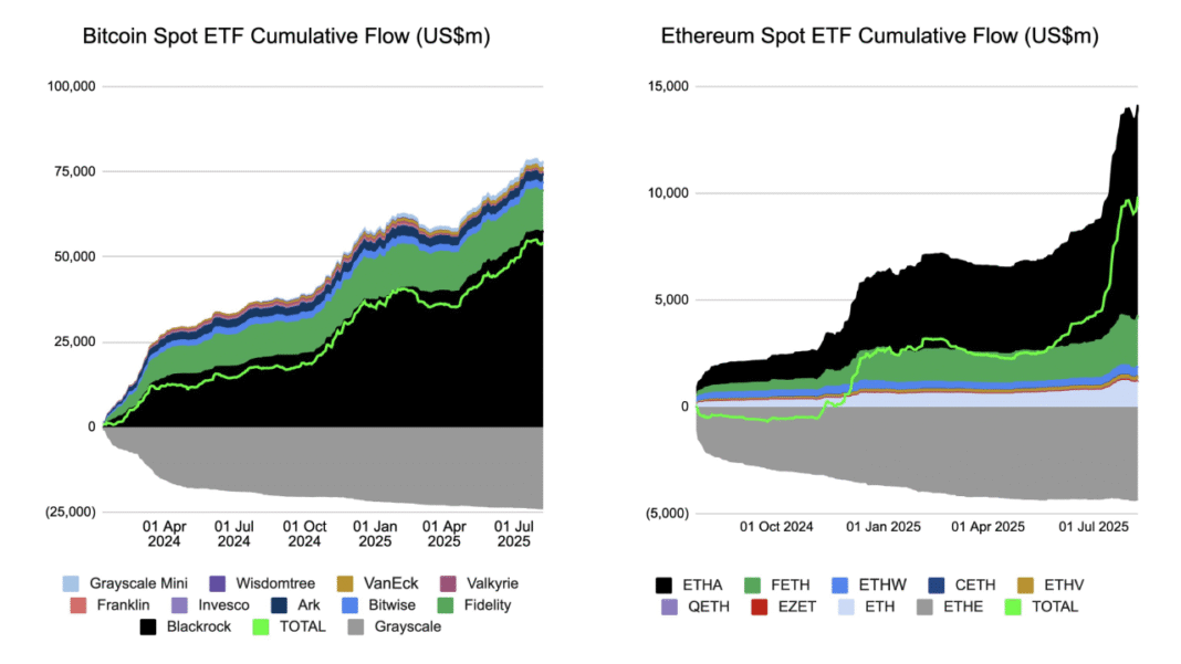 First, data showed that total inflows into US-listed crypto ETFs reached approximately $12.8 billion in July. Miles also highlighted that “spot BTC & ETH ETFs alone” have attracted around $17 billion in net inflows over the past 60 days. This has significantly impacted liquidity and the valuation of these assets.
