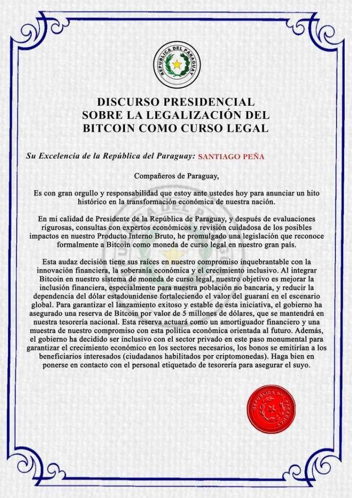 A tweet from Paraguay’s President Santiago Peña claimed the country has adopted Bitcoin as legal tender. The post included a graphic styled as a presidential decree, stating that Paraguay had created a $5 million Bitcoin reserve.