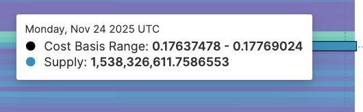 Even with the DOGE ETF boost and whale accumulation, Dogecoin now faces its largest supply block in weeks. The cost-basis heatmap shows a dense cluster of 7.03 billion DOGE between $0.17 and $0.18.