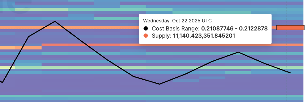 Two massive supply clusters — between $0.202–$0.206 and $0.210–$0.212 — hold roughly 11.16 billion DOGE and 11.14 billion DOGE, respectively. These are just the largest pockets; smaller clusters with fewer coins also exist across the range.