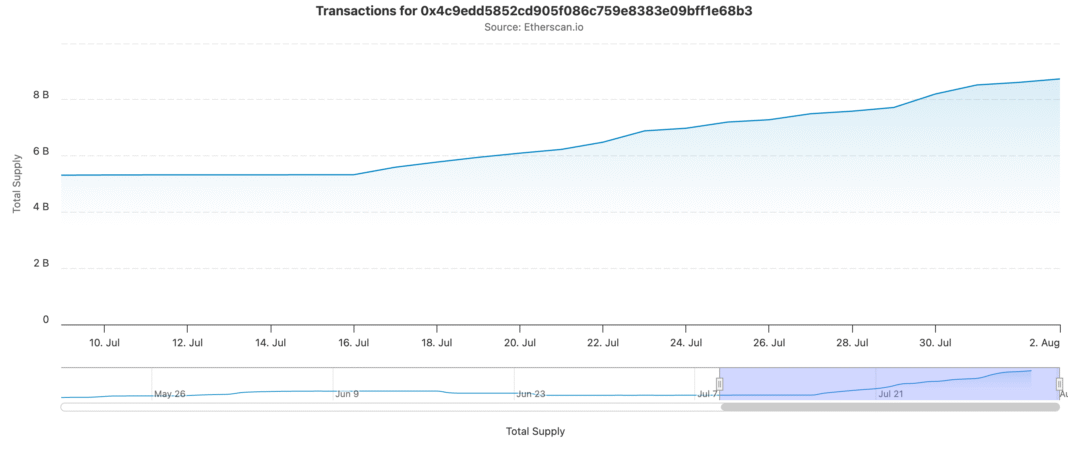According to data from Etherscan, USDe’s circulating supply is at an all-time high of $8.73 billion, up more than $3.4 billion since July 16.