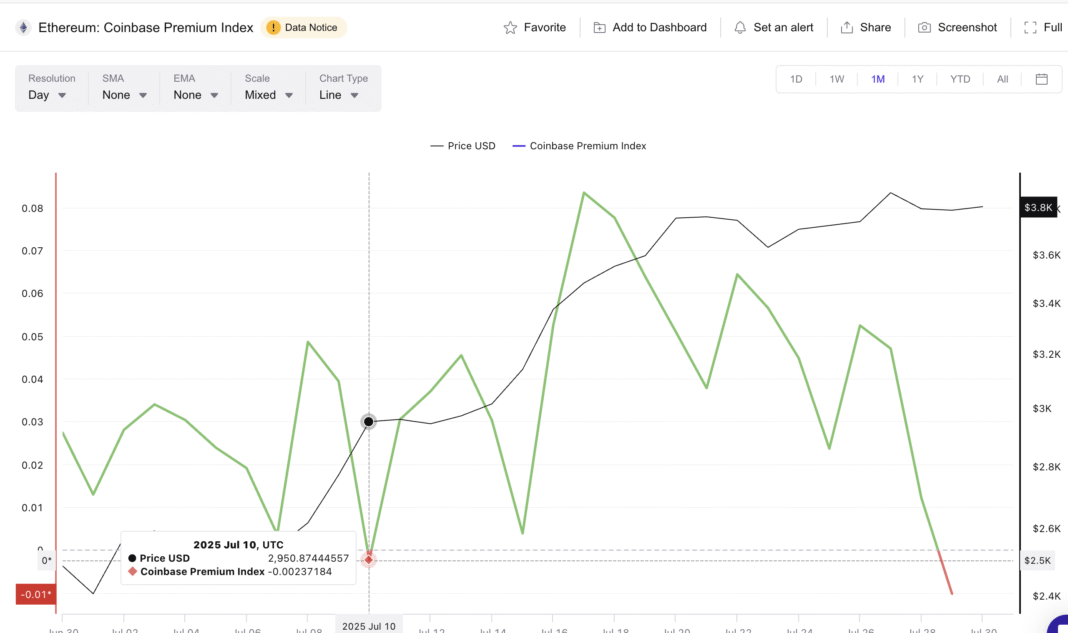 One of the most telling signals comes from the Coinbase Premium Index. This indicator measures the difference between Ethereum’s price on Coinbase and other global exchanges.