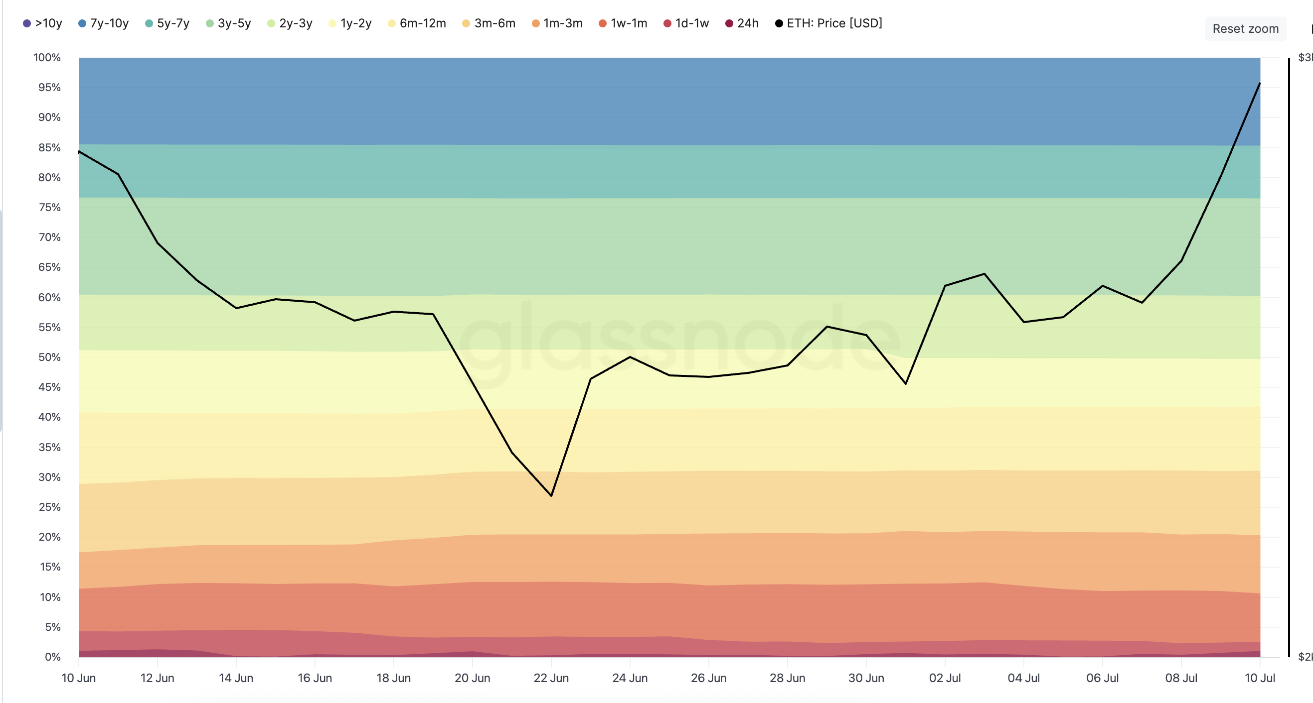 ETH price break above $3,000 isn’t just technical; it’s behavioral. According to Glassnode’s HODL Waves, which measure the percentage of ETH held across different age bands, short-term holders (especially 1w–1m, 1m–3m, and even 10Y bands) have grown steadily over the past few days.