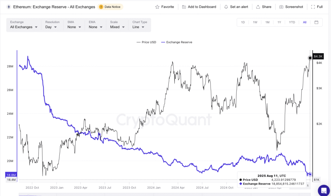 Ethereum Exchange Reserves Sink—Is All-Time High Imminent?