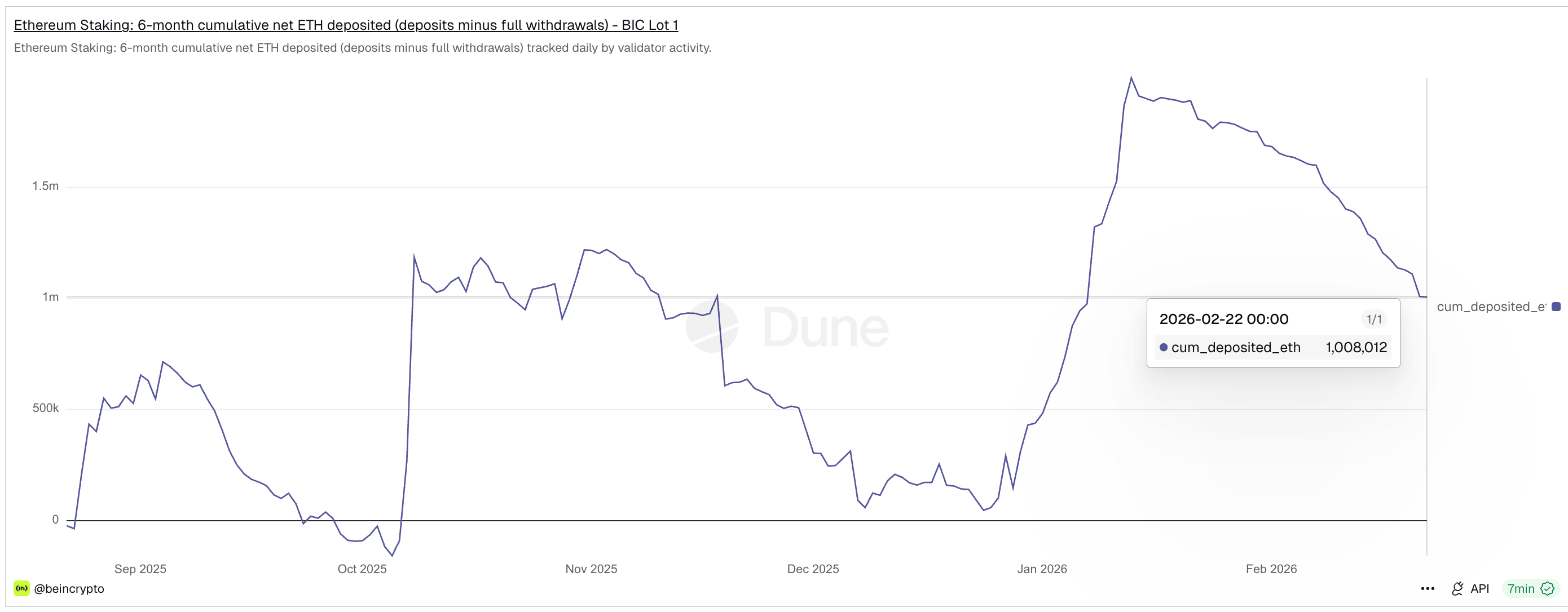 Ethereum’s 6-month cumulative net staking deposits dropped from 1,994,282 ETH on January 13 to 1,008,012 ETH on February 22. This is a decline of about 986,000 ETH, or nearly 50%.