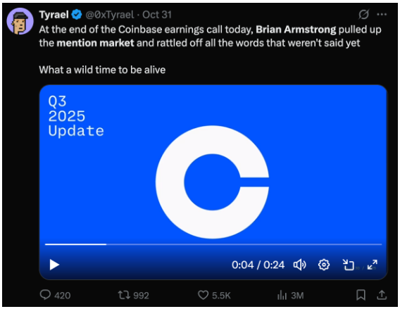 New categories in the prediction market space are continually developing. One of these gaining popularity are “mention markets” where bets are placed on what celebrities or other public figures say. Coinbase CEO Brian Armstrong recently read through a list of words in a market for him on his company’s earnings call; crypto social media voraciously ate it up.