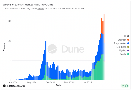 This emergence is being powered by a river of money entering into prediction market platforms. At the beginning of November, the total notional volume traded on prediction markets hit a record-high $3.3 billion according to data aggregator Dune Analytics. Kalshi had around $1 billion, Polymarket approximately $1 billion, and the just-launched BNB Chain-based Opinion led the way with $1.4 billion.