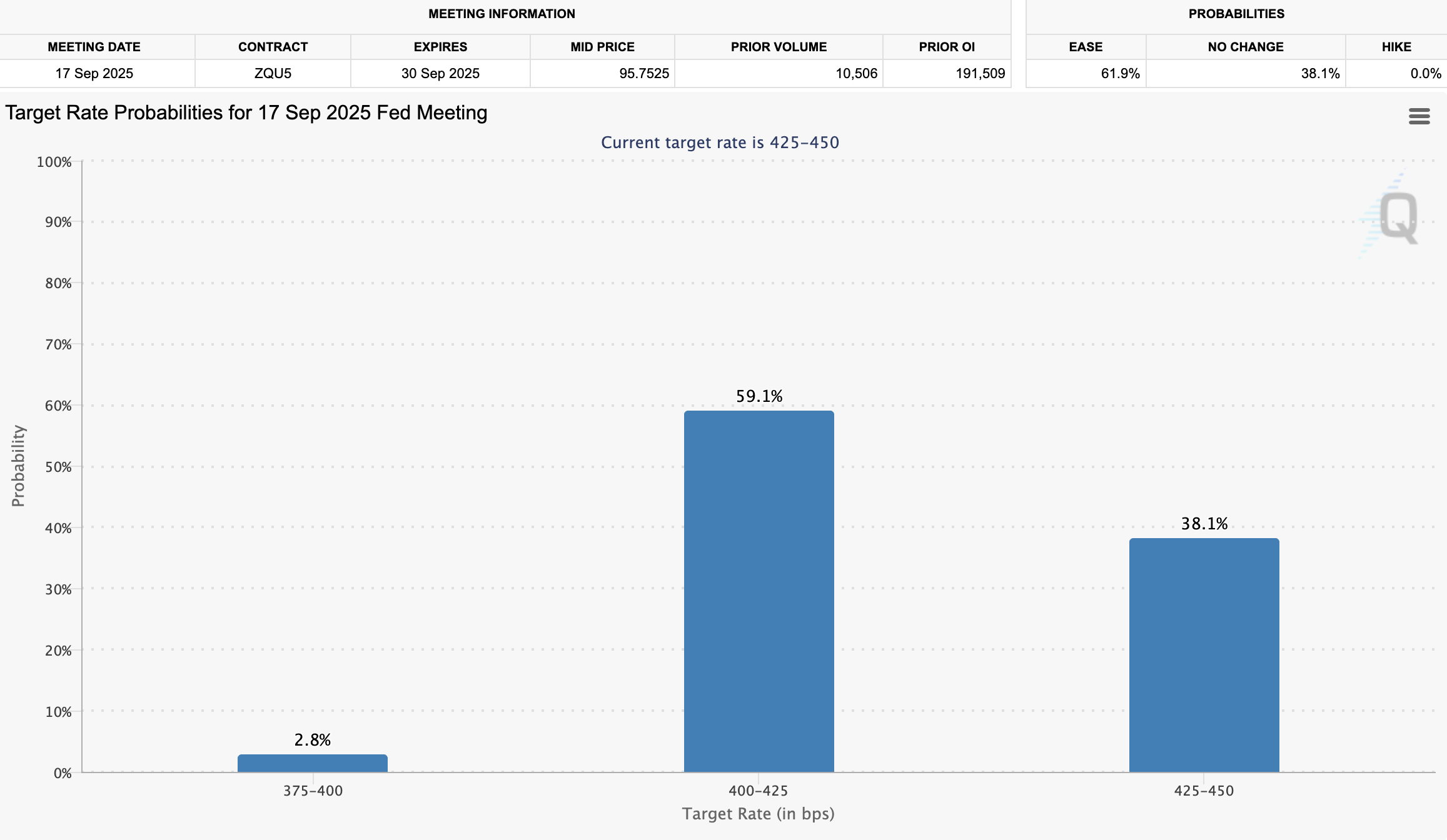 The tariff letters have now impacted the odds for September. According to the CME FedWatch Tool, the chances of a rate cut by September have declined to 61.9%, marking a huge drop from 90% just two weeks ago.