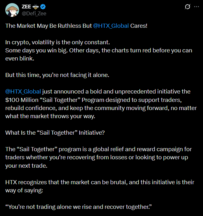 HTX announced the launch of its “Sail Together” initiative, distributing $100 million in USDT to traders affected by the October 11 market downturn that triggered liquidations exceeding $19 billion across crypto markets.