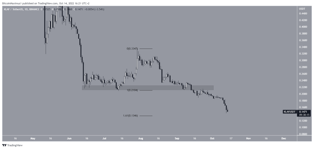 So far, KLAY price has reached a new all-time low of $0.142 on Oct. 13. The next closest support area is at $0.135, created by the 1.61 external Fib retracement of the most recent upward movement.