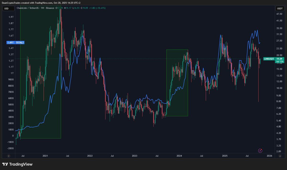 Several technical analysts, such as Daan, point out that Chainlink has historically outperformed the altcoin index (TOTAL2) during strong market rallies since 2021. Each time a similar accumulation pattern appears, LINK is often among the first tokens to lead the next wave. Michaël van de Poppe, sharing the same view, noted that the LINK/BTC price structure shows signs of a major breakout ahead.