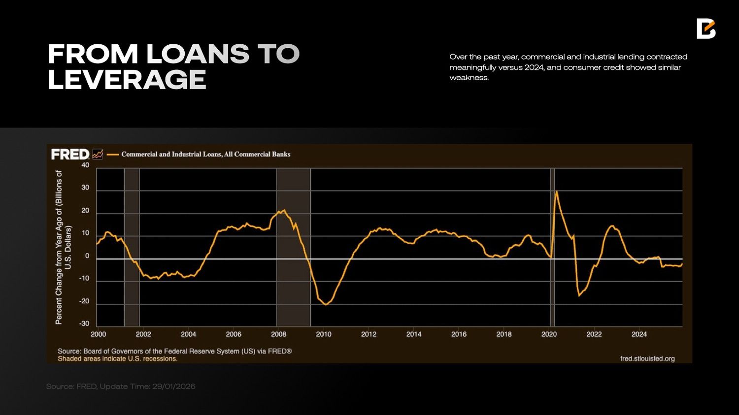 Over the past year, commercial and industrial lending contracted meaningfully versus 2024, and consumer credit showed similar weakness. By contrast, VettaFi data suggest that margin debt rose 36.3% over the past year, reaching an all-time high of $1.23T in December 2025, while investors’ net debit balances also expanded to $ -814.1 billion—broadly matching the pace of margin debt growth.