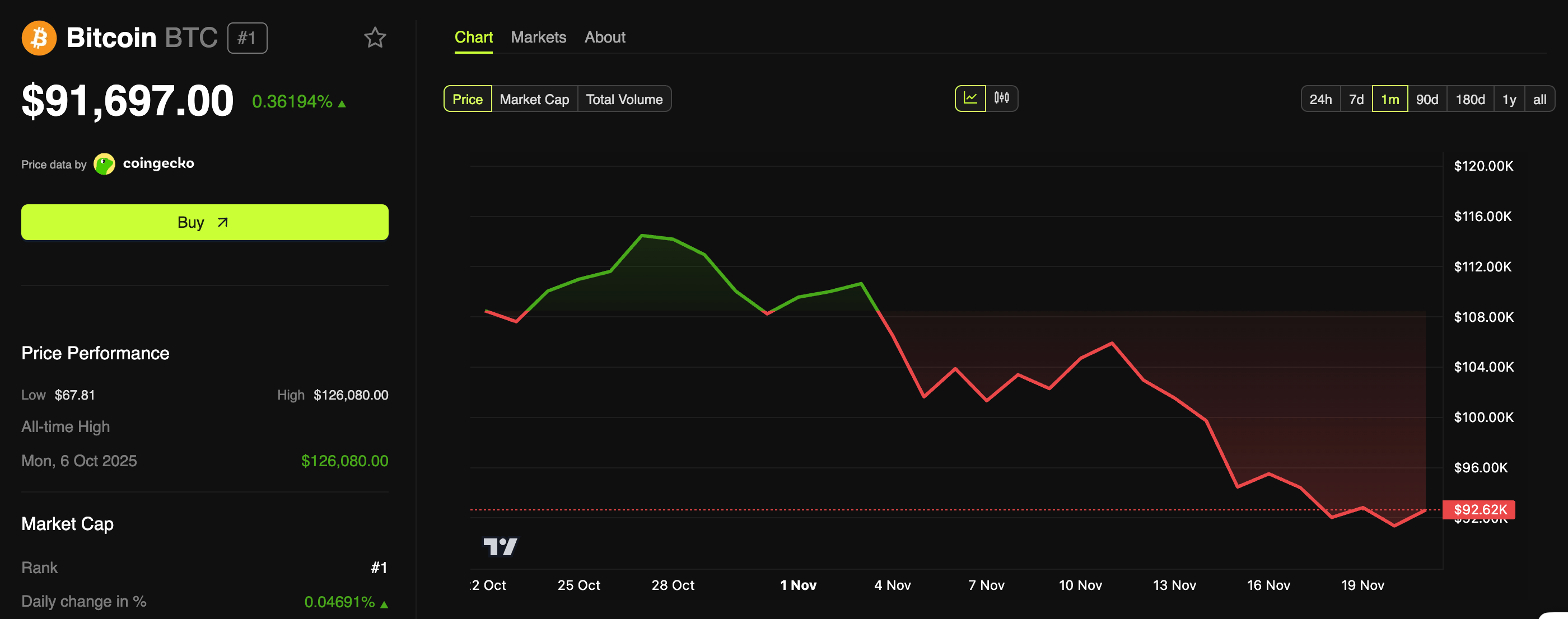 At press time, it traded at $91,697, representing modest daily gains of 0.36194%.