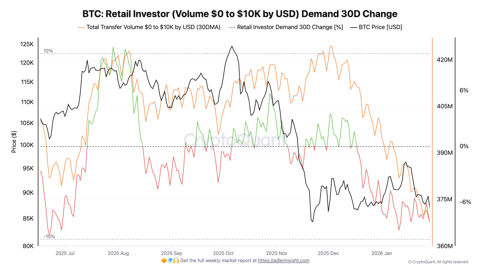 On the retail side, on-chain data from CryptoQuant shows small transactions between $0 and $10,000 declining steadily, with 30-day demand growth falling from above 10% in October to around -6% now.