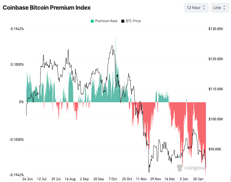 The Coinbase Premium Index, which tracks the price gap between Coinbase and global exchanges and serves as a barometer for US institutional interest, has also turned negative. Both indicators point to a waning appetite among institutional buyers who drove much of the 2024-2025 rally.