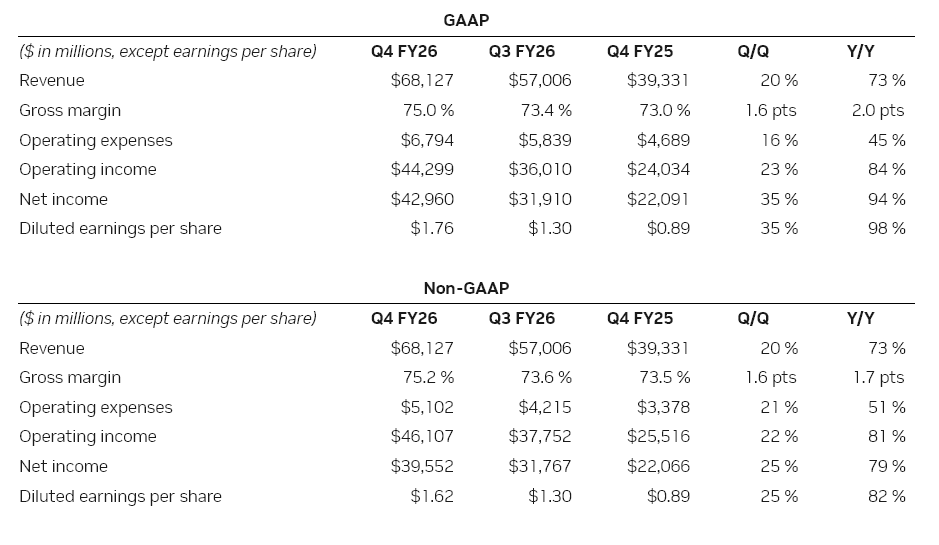 The company reported quarterly revenue of $68.1 billion, up sharply from a year earlier and above Wall Street expectations. Adjusted earnings per share came in at $1.62, also beating forecasts.