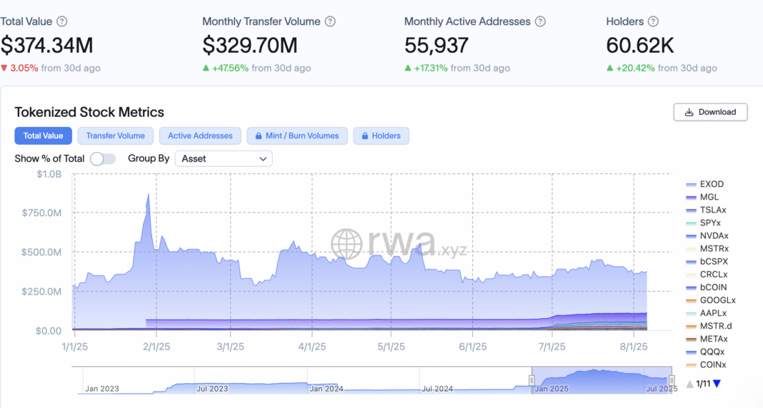 According to data from RWA.xyz, the tokenized stocks market has reached a market cap of $374 million, up 220% since June. Monthly transfer volume sits at around $330 million. Algorand commanded 66% of the tokenized stock market share, mainly driven by the EXOD stock from Exodus.