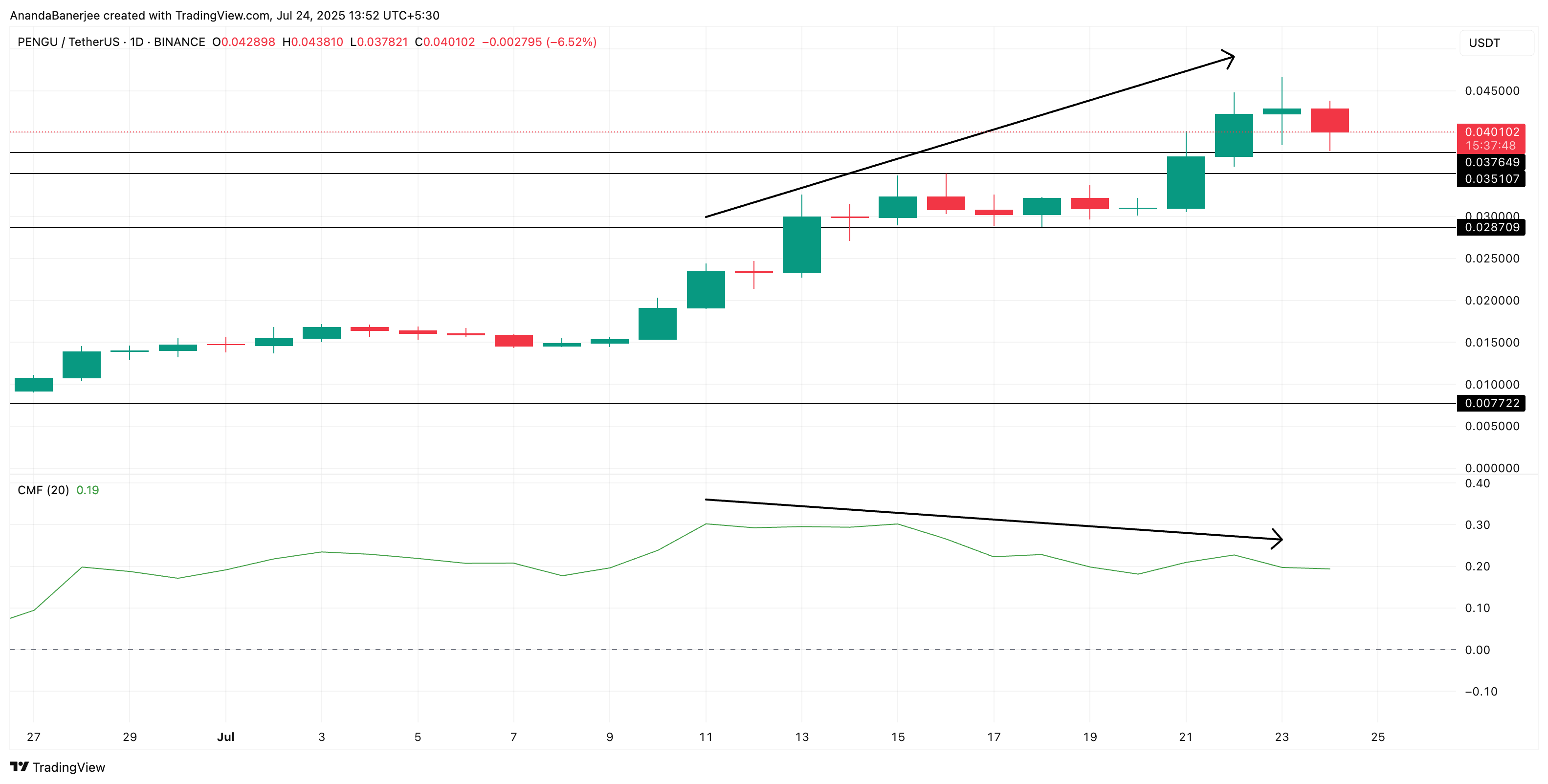 Chaikin Money Flow (CMF), a measure of accumulation and distribution, is flashing a bearish divergence. While PENGU’s price made higher highs earlier this month, CMF has now formed consecutive lower highs, a pattern last seen since May. This pattern points to waning buying pressure, even as the price tried to push up.