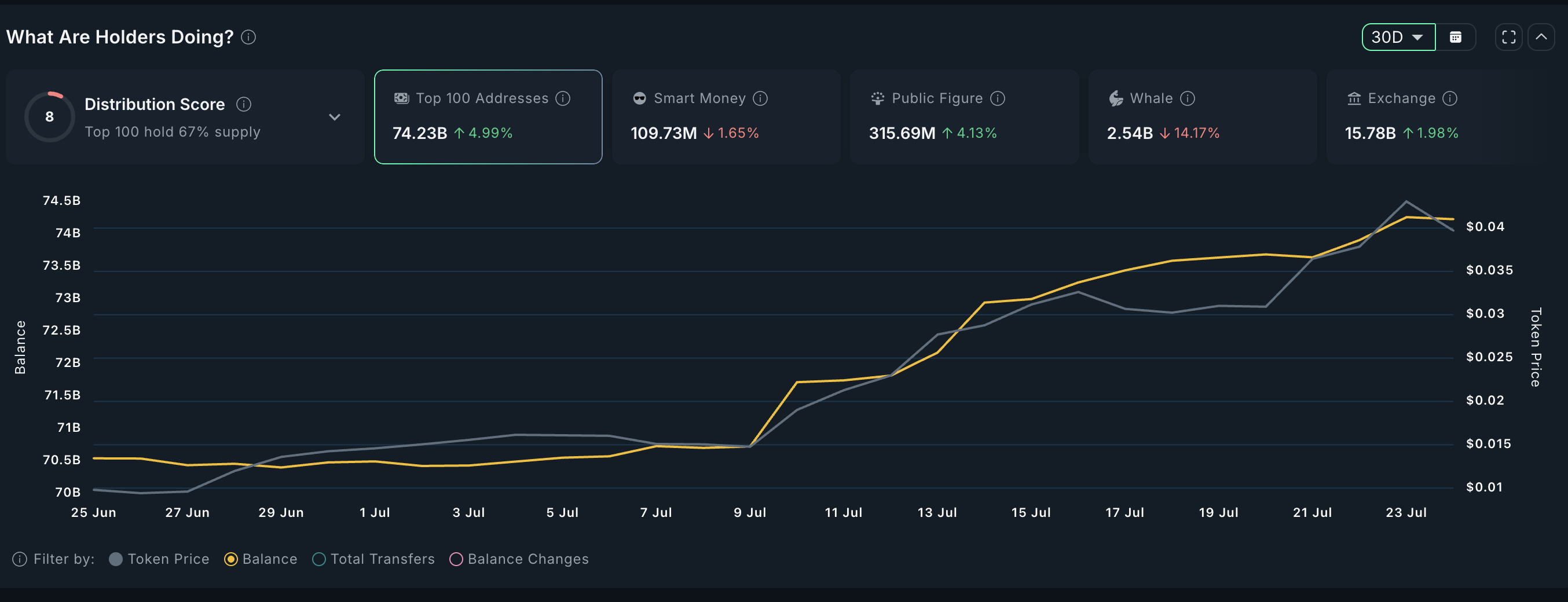 Whale activity continues to lean bearish. In the last 24 hours, whales trimmed another 2.4% of PENGU’s circulating supply. At the current price of $0.04, that’s around 152 million PENGU tokens worth over $6 million. While the pace of selling has slowed compared to the 30-day and 7-day trends, the overall direction remains downward.