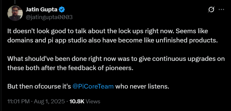 Others expressed disappointment with the slow rollout of promised ecosystem features. Tools like Pi Domains and App Studio remain either unfinished or inactive, despite earlier previews.