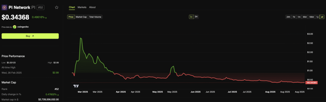 Real-time data shows PI trading around $0.34 on the market side, just above the all-time low of $0.3312 (August 26, 2025). This thin margin could easily break if bearish sentiment intensifies. Considering that the most recent all-time high was recorded at $2.99 last February, this shows how months of steady decline have erased most of this year’s earlier gains.