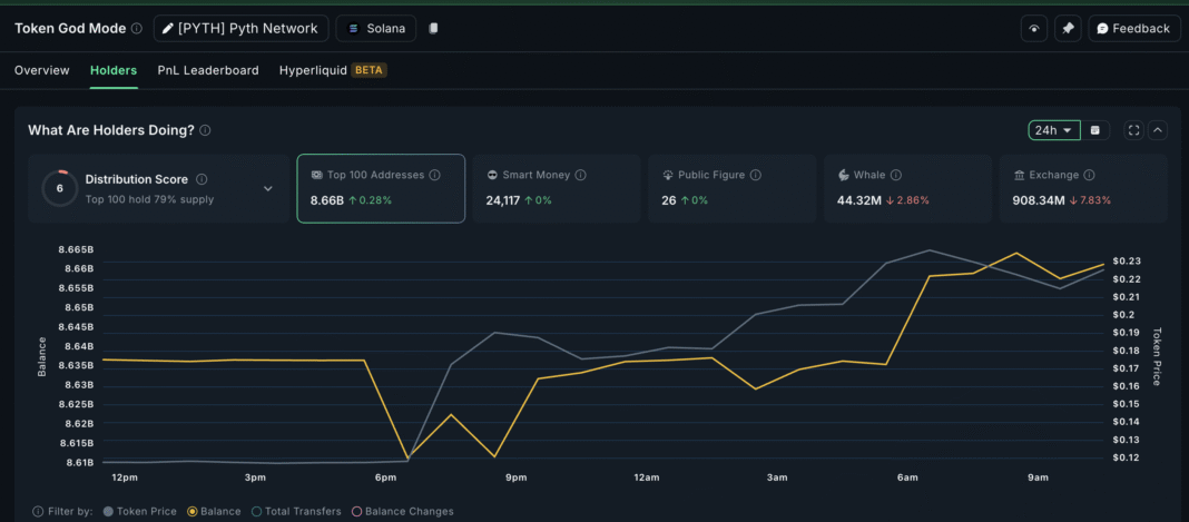 At the same time, the top 100 addresses (another category of whales or mega whales) added 24.1 million PYTH, worth around $5.37 million. Taken together, buyers absorbed more than $22 million worth of tokens. While regular whales took some profit, overall demand stayed strong.