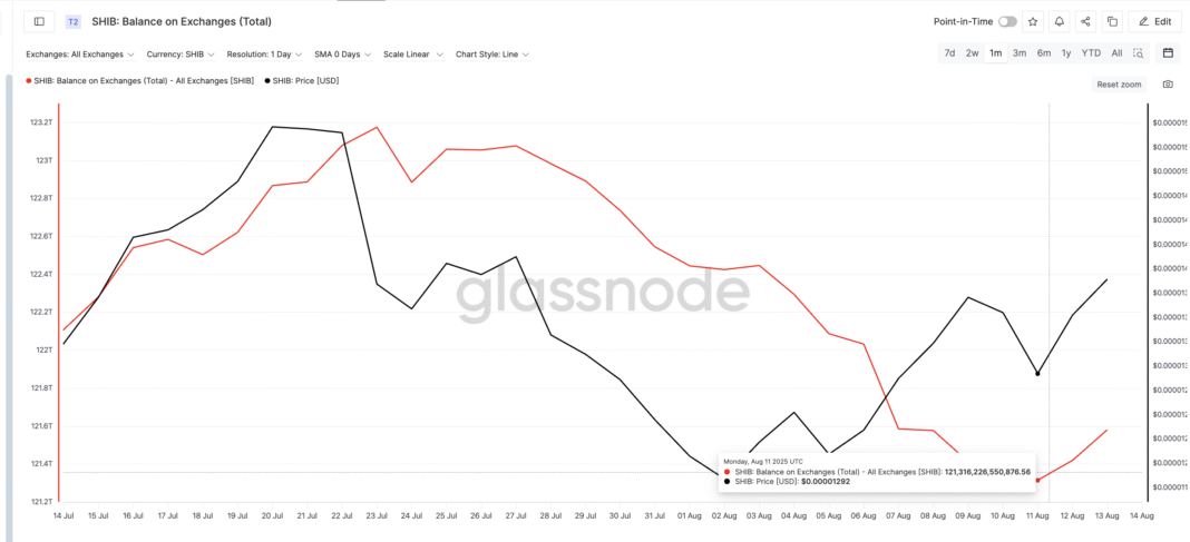 In SHIB’s case, July 31 balances were 122.54 trillion tokens, dropping to 121.31 trillion by August 11 — a nearly 1% decline. This signals reduced sell pressure, creating favorable conditions for bulls to extend the Shiba Inu price rally.