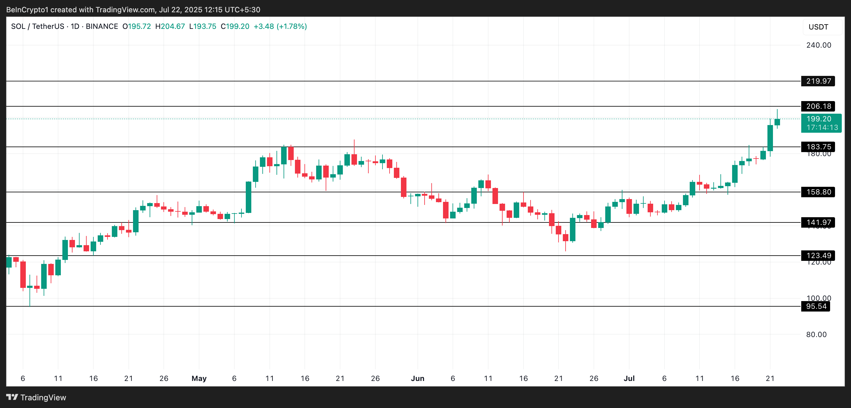 SOL has posted double-digit gains over the past week and now trades at $198.43, edging closer to the psychologically significant $206 level, a price it last held in February.