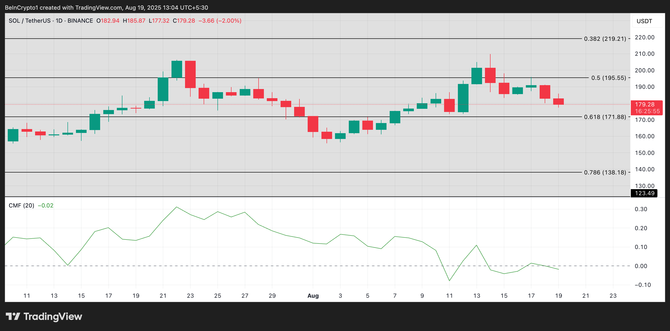 However, risks remain. SOL’s Chaikin Money Flow (CMF), which measures capital inflows, is trending lower, implying that liquidity is drying up. Without renewed inflows, any rebound led by LTHs could struggle to gain sustained momentum.