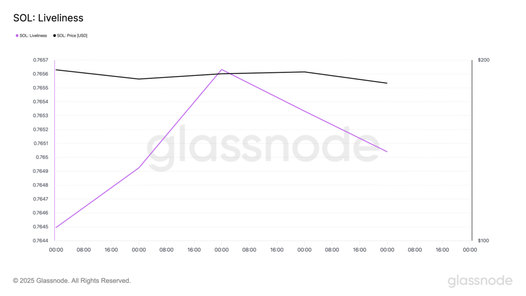 The Liveliness metric tracks the movement of long-held/dormant tokens by calculating the ratio of coin days destroyed to the total coin days accumulated. When it trends upward, more dormant tokens are being moved, signaling profit-taking by long-term holders.